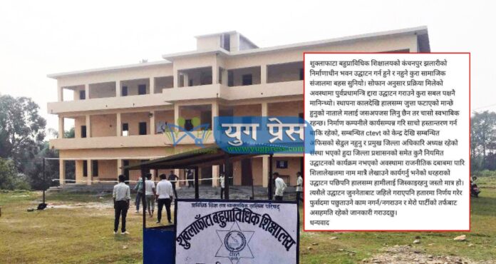 कञ्चनपुर, फागुन ३० : कञ्चनपुरको शुक्लाफाँटा बहुप्राविधिक शिक्षालयको अधुरो भवन उद्घाटनको विषयलाई लिएर स्थानीय स्तरमा राजनीतिक दलहरुविच विवाद उत्पन्न भईरहेको बुझिन्छ ।