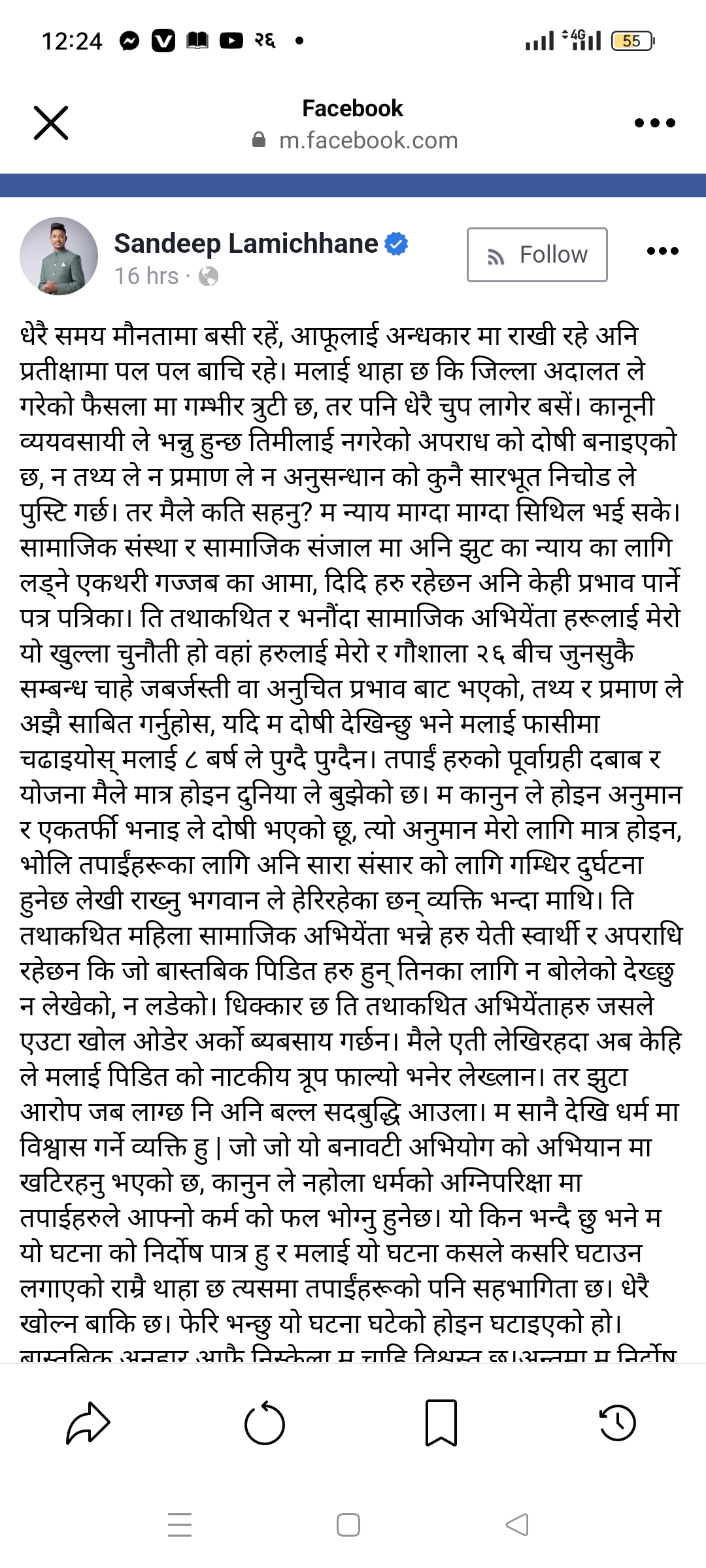 लामिछानेविरुद्धको बलात्कारसम्बन्धी मुद्दा अदालतमा विचाराधीन रहेकै बेला उनले सामाजिक अभियन्ता र आफूमाथि खनिइरहेकाहरूप्रति समेत कटाक्ष गरेका हुन् ।