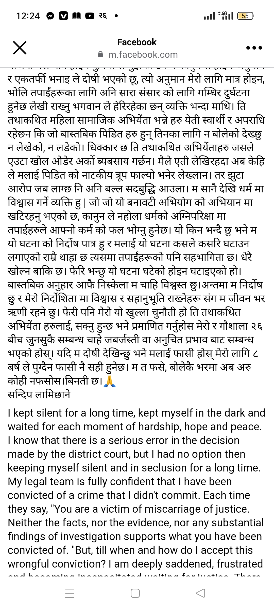 उनले भनेका छन्, ‘म यो घटनाको निर्दोष पात्र हुँ र मलाई यो घटना कसले कसरी घटाउन लगाएको राम्रै थाहा छ । त्यसमा तपाईंहरूको पनि सहभागिता छ। धेरै खोल्न बाँकी छ। फेरि भन्छु यो घटना घटेको होइन घटाइएको हो ।’