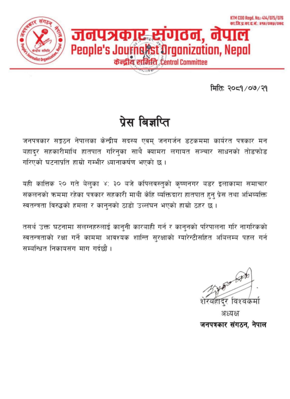 जनपत्रकार संगठन, नेपालका अध्यक्ष शेर बहादुर बिश्वकर्माले एक विज्ञप्ति जारी गरी मंगलबार बेलुका ४.३० को समयमा कपिलवस्तुको कृष्णनगर भन्सार ईलाकामा समाचार संकलन गर्ने क्रममा पत्रकार मानबहादुर सहकारी सहितको टोलीलाई केही व्यक्तिद्वारा हातपात तथा लुटपाट गरेकोप्रति संगठनको गम्भीर ध्यानाकर्षण भएको उल्लेख गरेका छन् ।