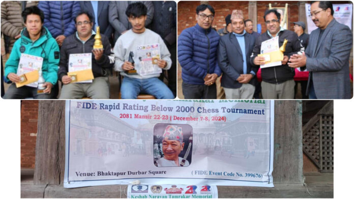भक्तपुर । भक्तपुर जिल्लाका पूर्व सिनियर राष्ट्रिय खेलाडी स्व.केशव नारायण ताम्राकारको स्मृतिमा सम्पन्न तेश्रो राष्ट्रब्यापी फिडे र्‍यापिड चेस प्रतियोगिताको उपाधि काभ्रेका शैलेन्द्र न्यौपानेले जितेका छन् । जित सँगै शैलेन्द्रले नगद १५ हजार र दुई तोला बराबर चाँदीको सिक्का हात पारेका छन्।