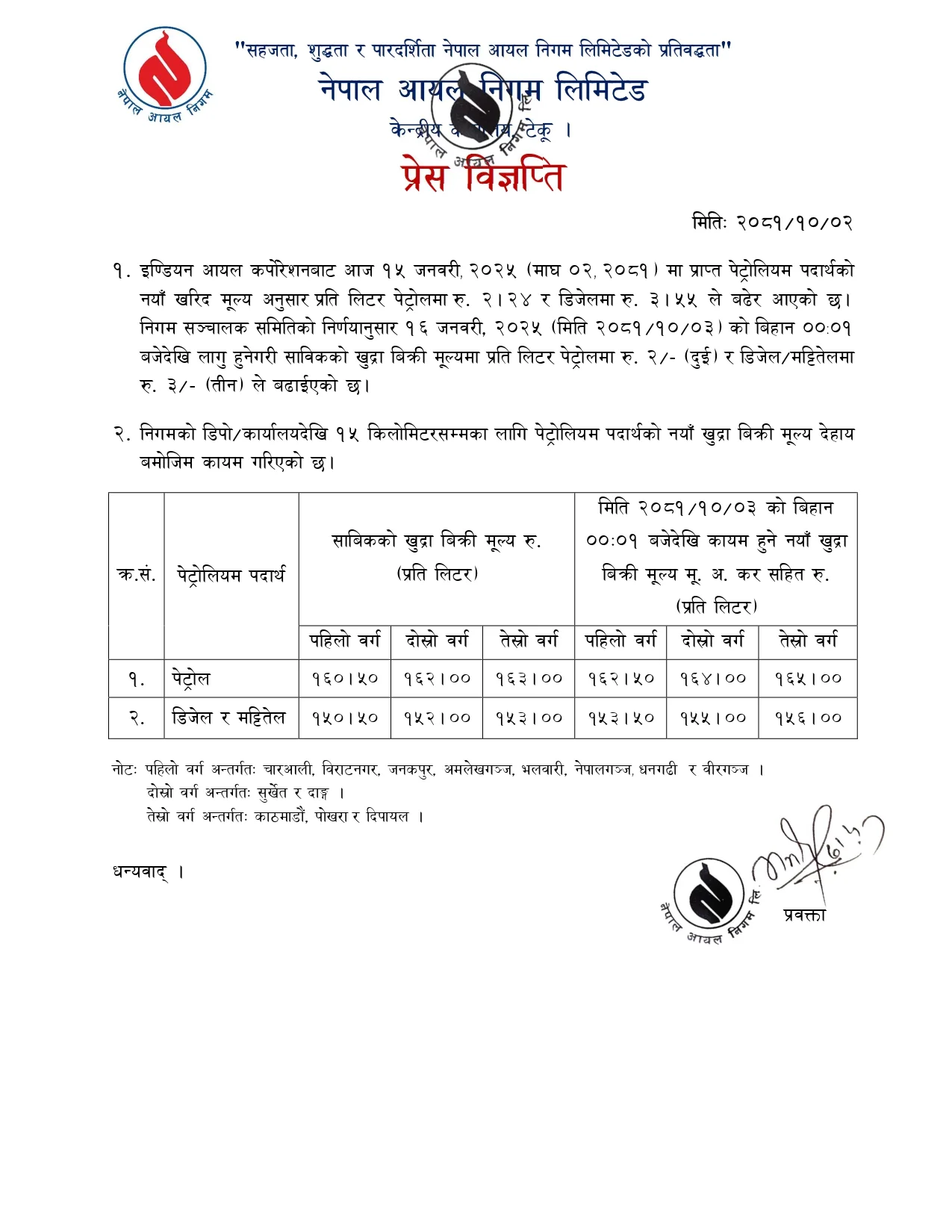इण्डियन आयल कर्पोरेशनबाट मूल्य वृद्धि भएर आएपछि नेपालमा पनि वृद्धि गरिएको निगमले विज्ञप्तिमार्फत जनाएको छ ।