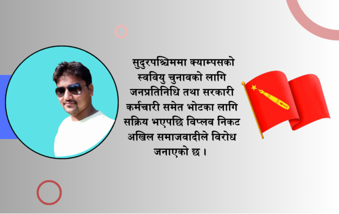 यसैका लागि विभिन्न दल निकट विद्यार्थी संगठन निर्वाचनमा होमिएका छन् । यो माहोल सुदुरपश्चिममा पनि तातिएको छ । यसै बीच सुदुरपश्चिममा क्याम्पसको स्ववियु चुनावको लागि जनप्रतिनिधि तथा सरकारी कर्मचारी समेत भोटका लागि सक्रिय भएपछि विप्लव निकट अखिल समाजवादीले विरोध जनाएको छ ।