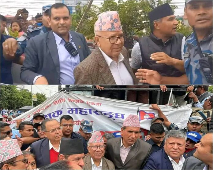 शिक्षक आन्दोलनमा ऐक्यबद्धता जनाउन पुगेका माधव–झलनाथ लखेटिए