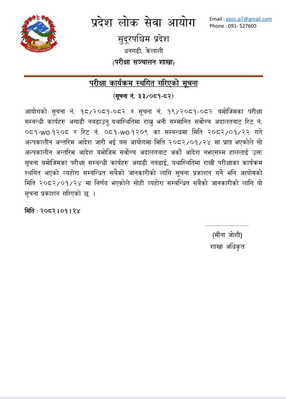 कैलाली । सुदूरपश्चिम प्रदेश लोक सेवा आयोगले फागुन २० गते जारी गरेको विज्ञापनअनुसारको बढुवा परीक्षा सर्वोच्च अदालतको आदेशपछि स्थगित गरिएको छ। नवौँ तहका अप्राविधिक/प्राविधिक अधिकृत पदका लागि तय गरिएको परीक्षा कार्यक्रम स्थगित भएको आयोगले सूचना जारी गर्दै जनाएको हो। सर्वोच्च अदालतले वैशाख २४ गते अल्पकालीन आदेश जारी गर्दै अर्को आदेश नभएसम्म परीक्षा नगर्न भनेपछि आयोगले परीक्षा प्रक्रिया अगाडि नबढाउने निर्णय गरेको हो।