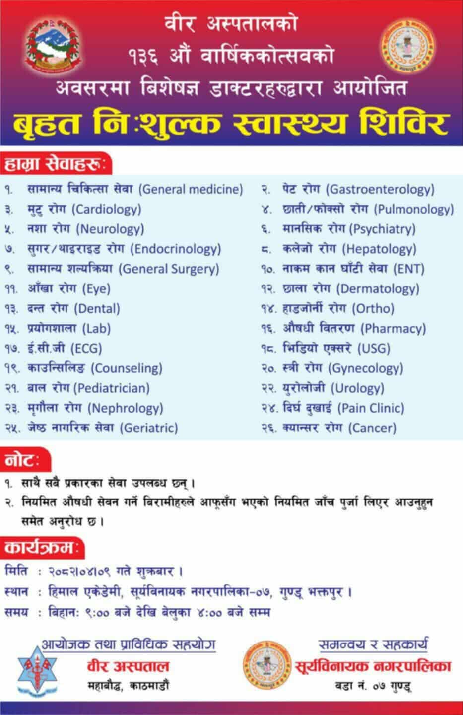 नगर प्रवक्ता तथा वडा नं. ७ का वडाध्यक्ष रविन्द्र सापकोटाका अनुसार, वीर अस्पतालका विशेषज्ञ चिकित्सकहरूको टोलीले शिविरमा सहभागी भएर विविध स्वास्थ्य सेवा निःशुल्क प्रदान गर्नेछन्। शिविर यही साउन ९ गते (शुक्रबार) बिहान १० बजेदेखि बेलुकी ४ बजेसम्म हिमालय एकेडेमी, सुर्यविनायक–७, गणेश, भक्तपुरमा आयोजना गरिएको हो।