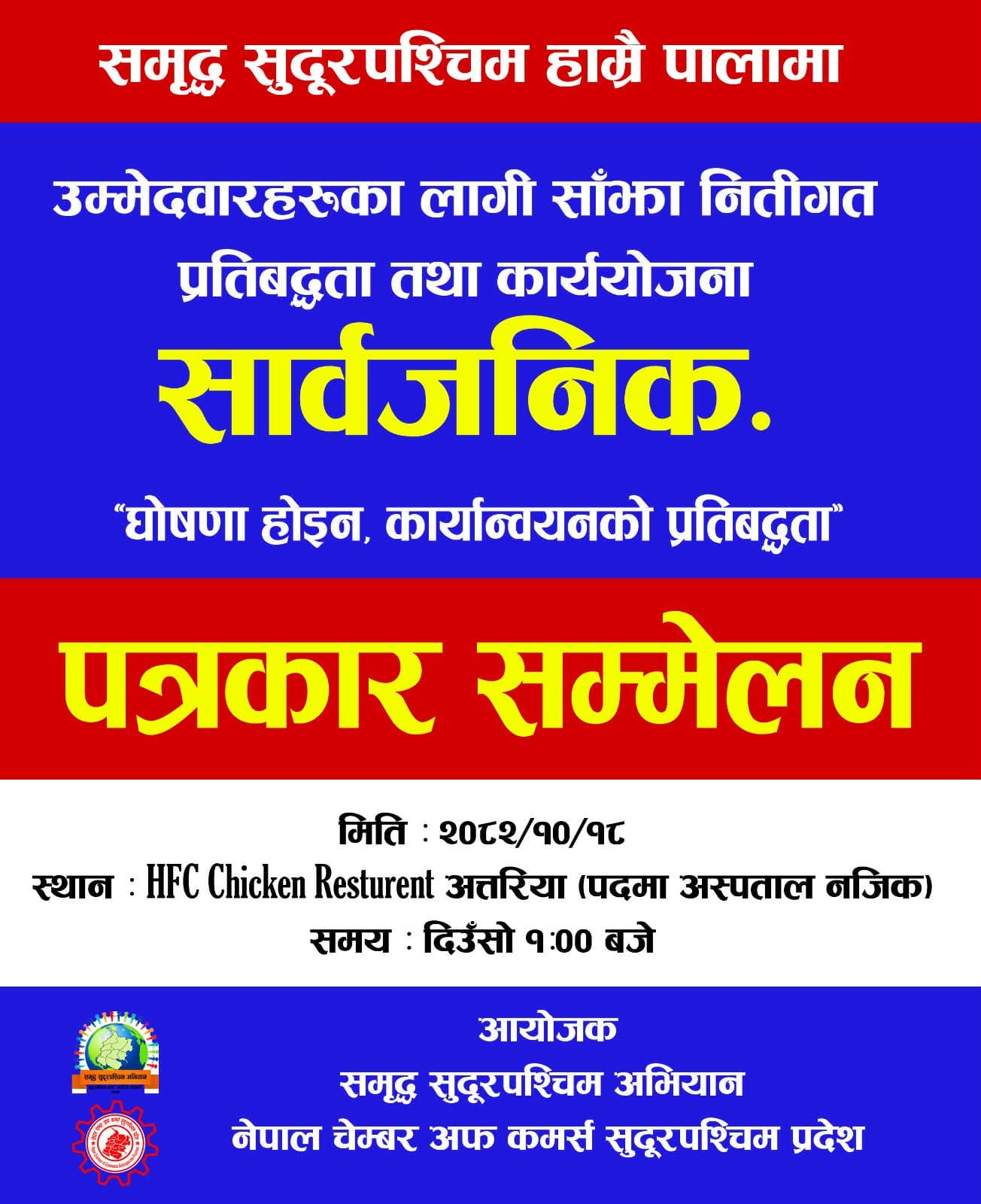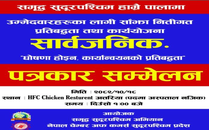 अत्तरिया । अत्तरिया, कैलाली “समृद्ध सुदूरपश्चिम हाम्रै पालामा” भन्ने मूल नाराका साथ सुदूरपश्चिम प्रदेशको समग्र विकास र समृद्धिका लागि उम्मेदवारहरूको साझा नीतिगत प्रतिबद्धता सार्वजनिक गरिने भएको छ। समृद्ध सुदूरपश्चिम अभियान र नेपाल चेम्बर अफ कमर्स, सुदूरपश्चिम प्रदेशको संयुक्त आयोजनामा आगामी माघ १८ गते एक विशेष पत्रकार सम्मेलनको आयोजना गर्न लागिएको हो।