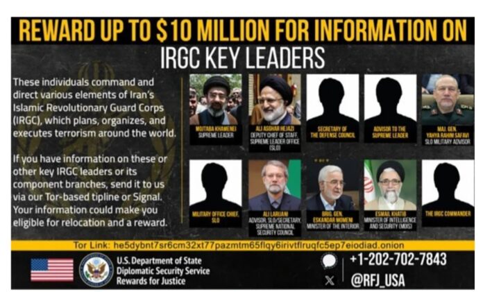 अमेरिकी विदेश मन्त्रालयले इरानका १० शीर्ष नेतृत्वको जानकारी दिने व्यक्तिलाई १ करोड डलर सम्मको पुरस्कार घोषणा गरेको छ। सार्वजनिक सूचीमा नयाँ सर्वोच्च नेता मोजतबा खामेनी र सुरक्षा परिषद् सचिव अली लारिजानी सहित ६ जनाको तस्बिर सार्वजनिक गरिएको छ। ‘इस्लामिक रिभोल्युसनरी गार्ड क्रप्स’ (IRGC) का विभिन्न सैन्य एकाइहरूको नेतृत्व गर्ने यी अधिकारीहरूले इरानको विदेश नीति र अर्थतन्त्रमा ठूलो प्रभाव राख्छन्।