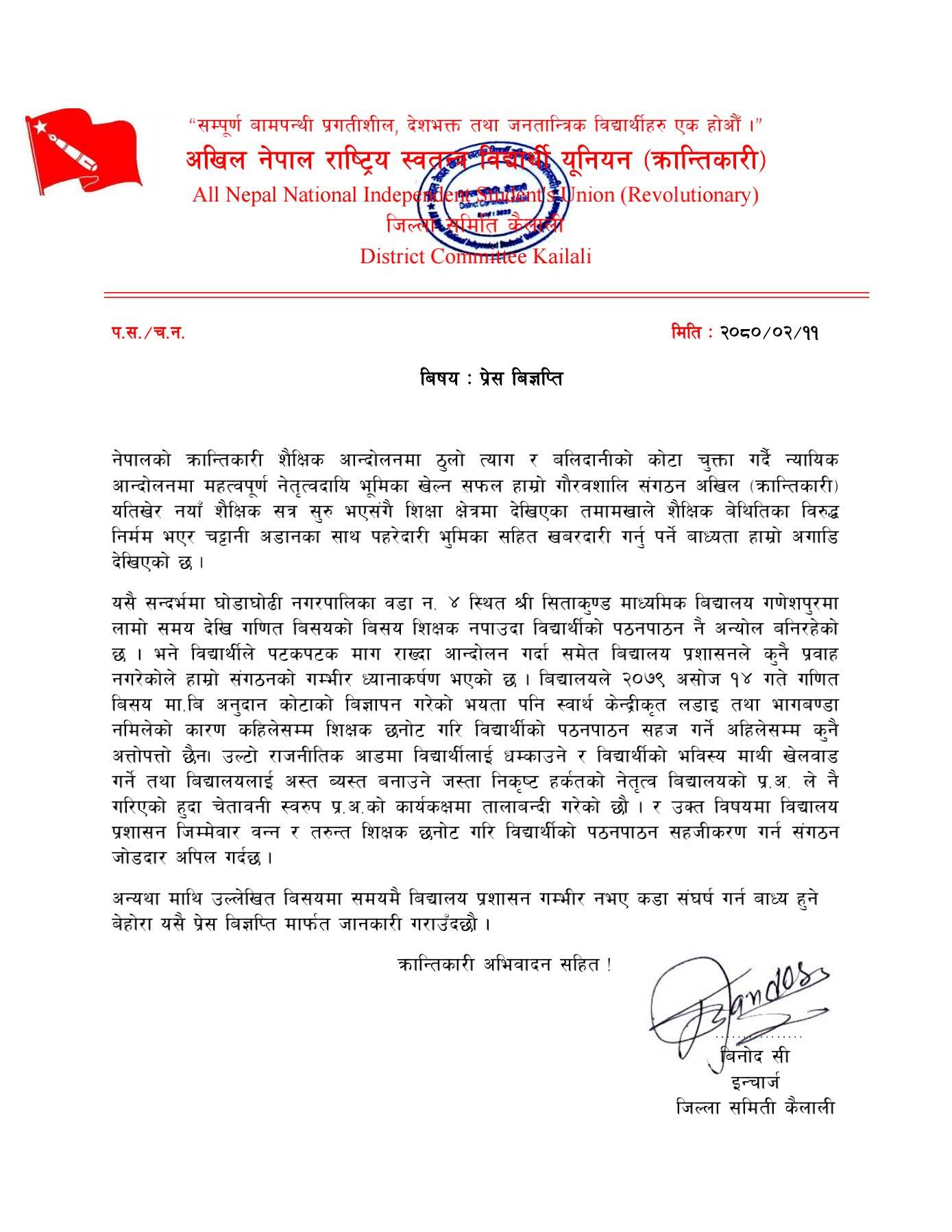 आबस्यक शिक्षक नियुक्त गर विद्यार्थीको पठनपाठन सहज र मर्यादित बनाउन संगठनको माग रहेको छ ।