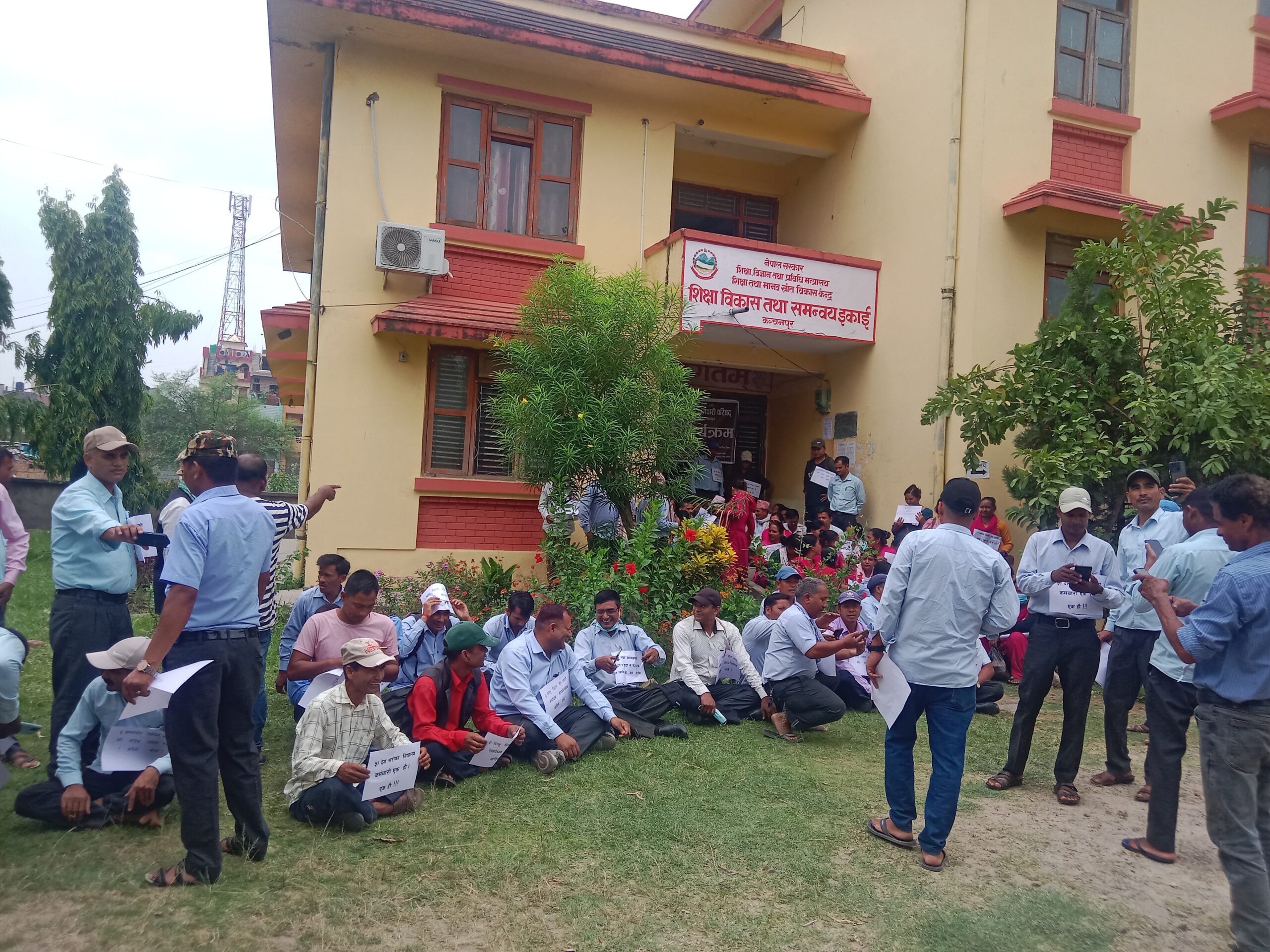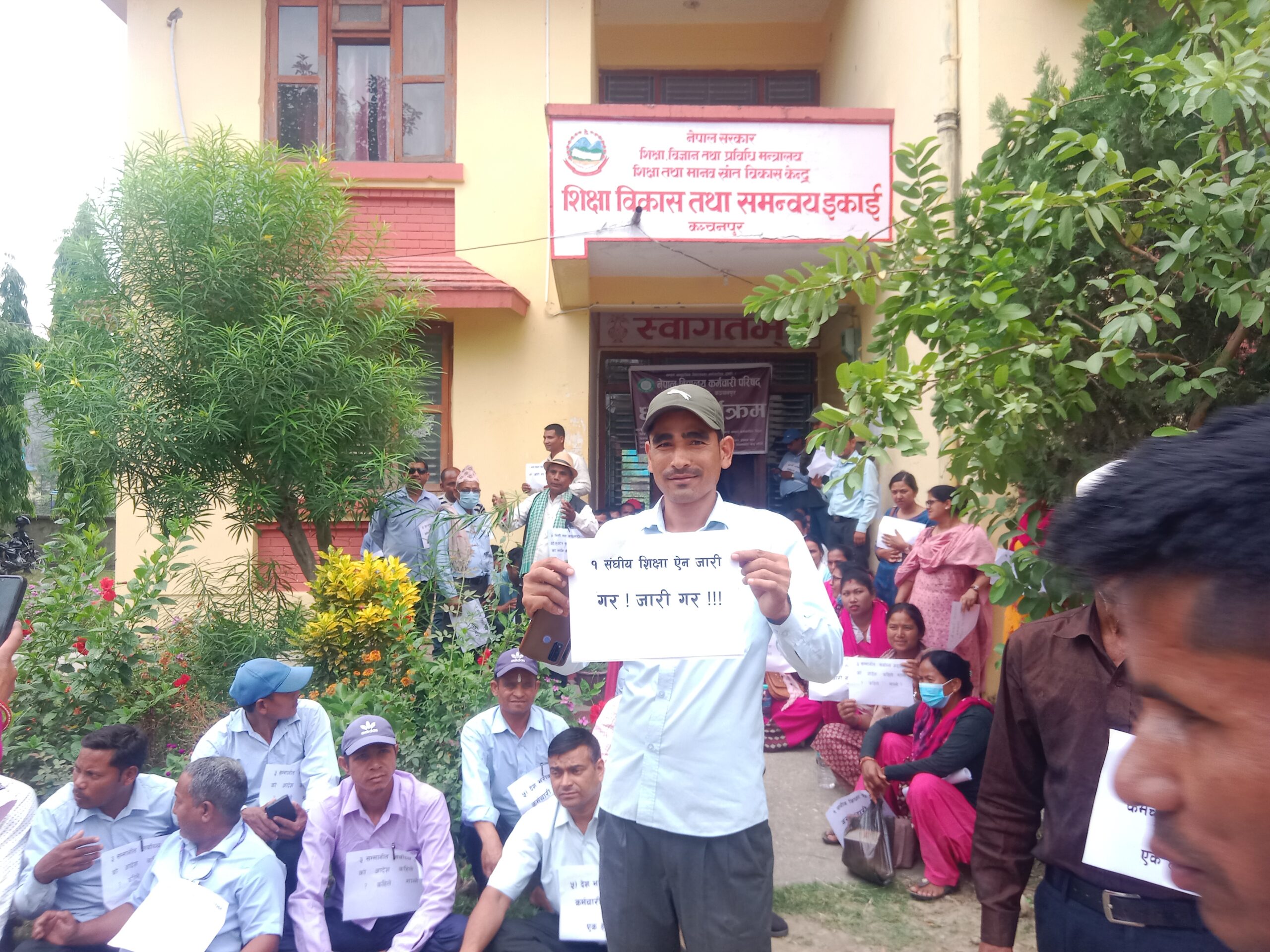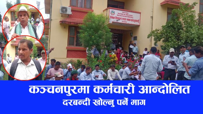 कञ्चनपुर , जेठ २२ : नेपाल सरकारले कर्मचारी दरबन्दी खुलाउनु पर्ने मागसहित सामुदायिक विद्यालयहरुका कर्मचारीहरु आन्दोलित भएका छन् । कञ्चनपुर जिल्ला भरि सामुदायिकहरुका आन्दोलित कर्मचारीहरूले शिक्षा विकास तथा समुन्वय इकाई कञ्चनपुरको कार्यालयमा जेठ २० गते देखि धर्ना दिएका छन् ।