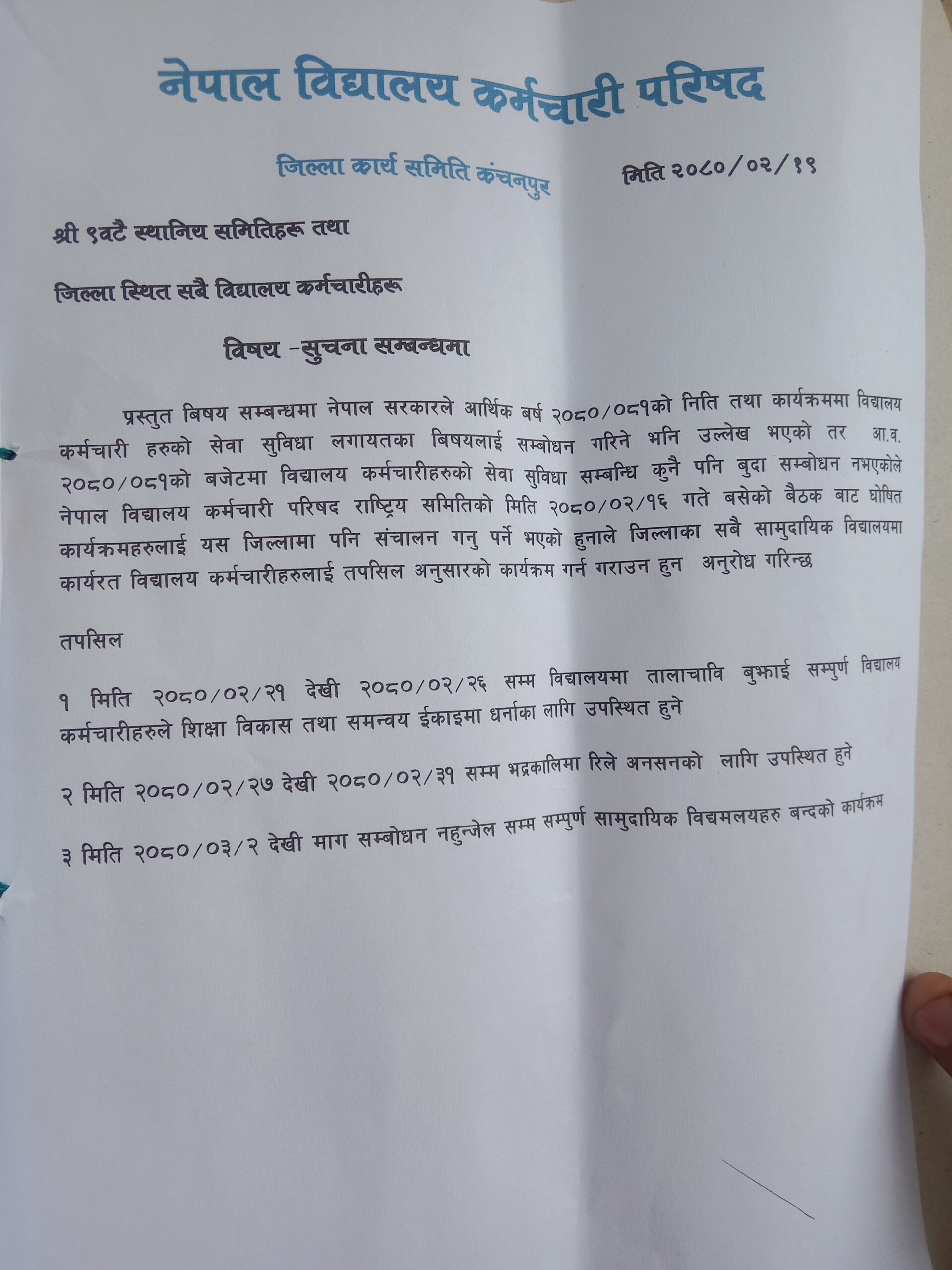 नेपाल विद्यालय कर्मचारी परिषद् कञ्चनपुरको नेतृत्वमा भइरहेको उक्त धर्ना मार्फत कर्मचारीहरूले नेपाल सरकारले कानुनी रुपमै आफूहरुलाई दरबन्दी खुलाउनु पर्ने माग राखेका छन् ।