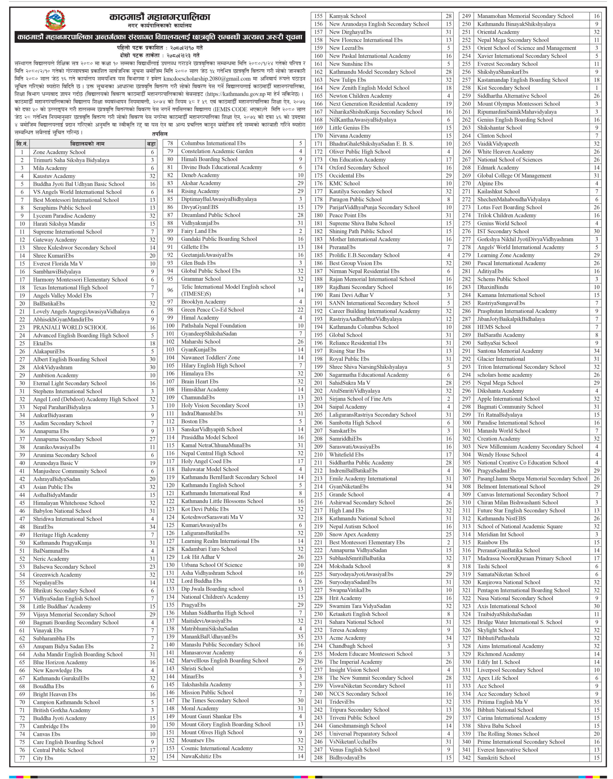काठमाडौं । काठमाडौं महानगरपालिका क्षेत्रभित्र सञ्चालनमा रही नियमानुसार छात्रवृत्ति नदिने ३४२ विद्यालयको सूचना प्रकासित गरेको छ । जेठ १५ भित्र छात्रवृत्ति प्रदान गरी त्यसको विवरण पठाउन दिएको निर्देशनको अवज्ञा गर्ने त्यस्ता विद्यालयको नामावली सार्वजनिक गरेको हो ।