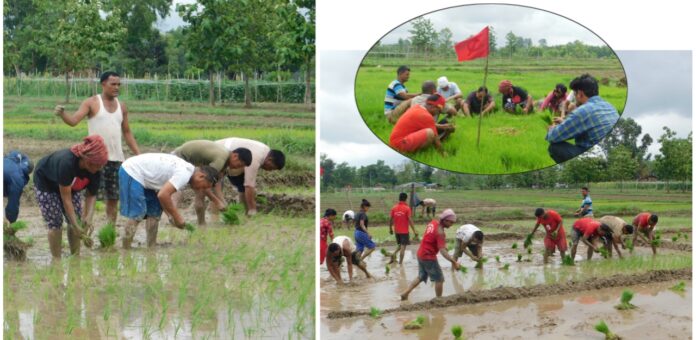 कैलाली , असार १५ : नेपाल कम्युनिष्ट पार्टी सेती ब्युरो द्वारा कैलालीमा धान रोपेको छ । शुक्रबार नेकपाले कैलालीको घोडाघोडी नगरपालिका ०८ दिपनगरमा नेकपा केन्द्रीय नेताहरूको सहभागितामा करिब १ बिघा जमीनमा धान रोप्दै श्रम उत्सव मनाएको हो ।