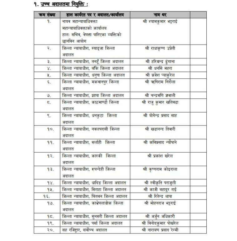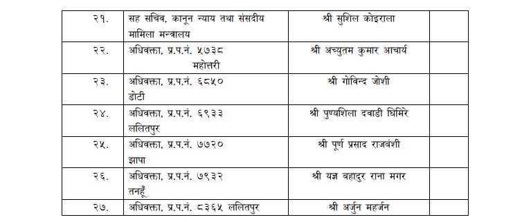 उनका अनुसार १८ जना जिल्ला न्यायाधीशबाट, न्याय सेवा, सरकारी वकिल र कानुन सेवाबाट तीन जना र कानुन व्यवसायीबाट ६ जनालाई उच्च अदालतको न्यायाधीशका लागि सिफारिस गरिएको छ । सिफारिस भएकाहरुलाई प्रधानन्यायाधीशले नियुक्त गर्नेछन् । परिषद बैठकले उच्च अदालतका ३४ र जिल्ला अदालतका २६ न्यायाधीशको सरुवा पनि गरेको छ ।