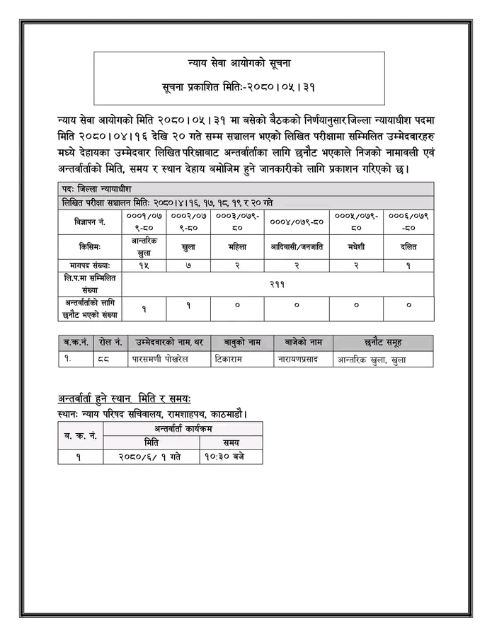 आयोगले आन्तरिक खुलातर्फ १५ जना, खुलातर्फ ७ जना, महिला २ जना, आदिवासी जनजाति २ जना, मधेशी २ जना र दलित १ जना गरी कुल २९ जना जिल्ला न्यायाधीशका लागि परीक्षा लिएको थियो । तर, १ जना मात्र उत्तीर्ण भएको न्याय सेवा आयोगले भदौ ३१ गते जारी गरेको सूचनामा उल्लेख छ ।