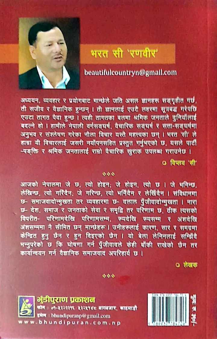 नेपाल कम्युनिष्ट पार्टीका स्थायी समिति सदस्य तथा कम्युनिष्ट आन्दोलनका क्रान्तिकारी योद्धा भरत सी (रणवीर) ले लेख्नु भएको यो पुस्तक भर्खरै बजारमा आएको हो । पुस्तकको खण्ड एक र खण्ड दुई छन् भने त्यसमा समय सान्दर्भिक तथा अति महत्वका लेखहरु समावेश छन् । पुस्तक कुल २०४ पेजको रहेको छ ।